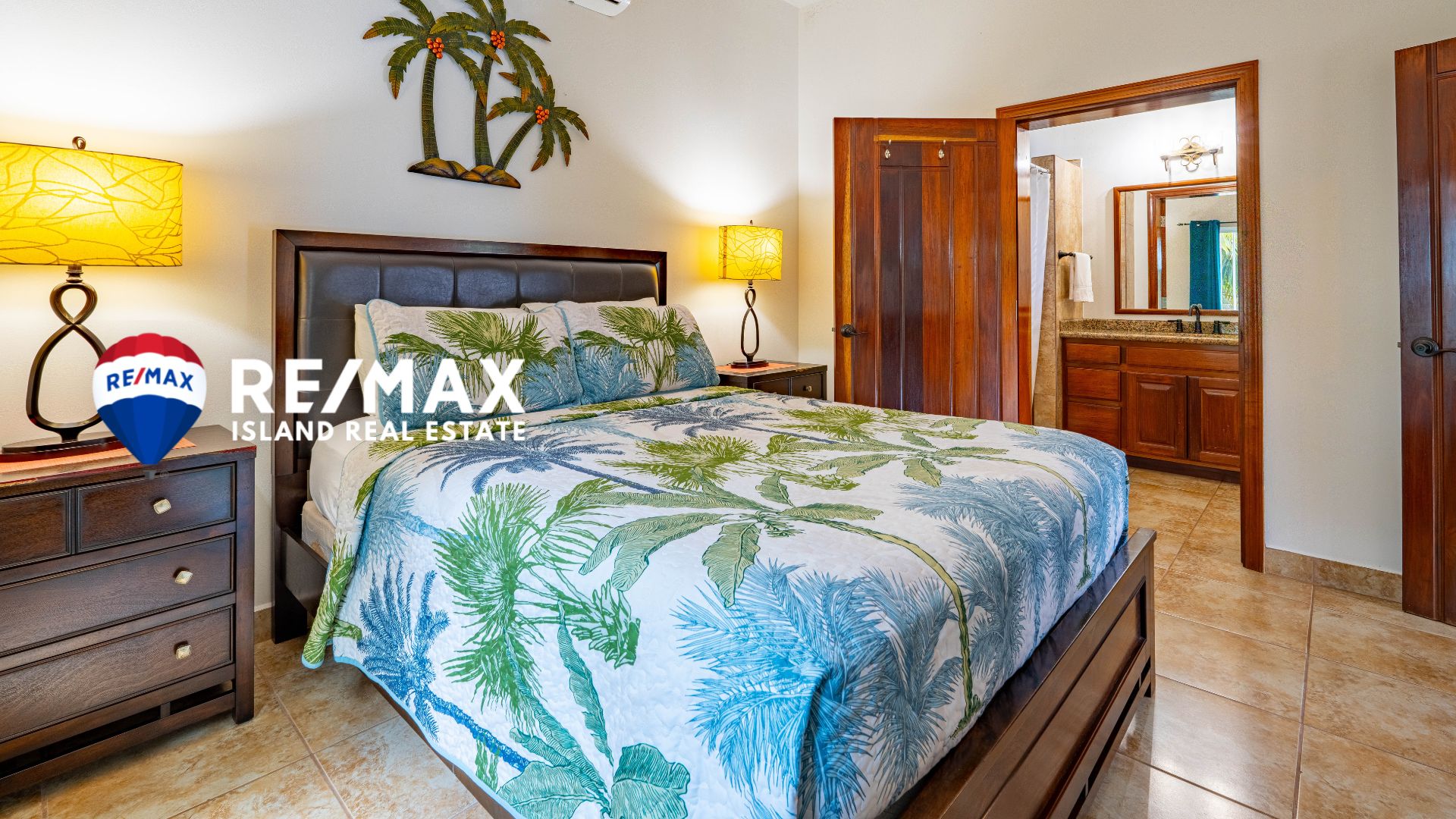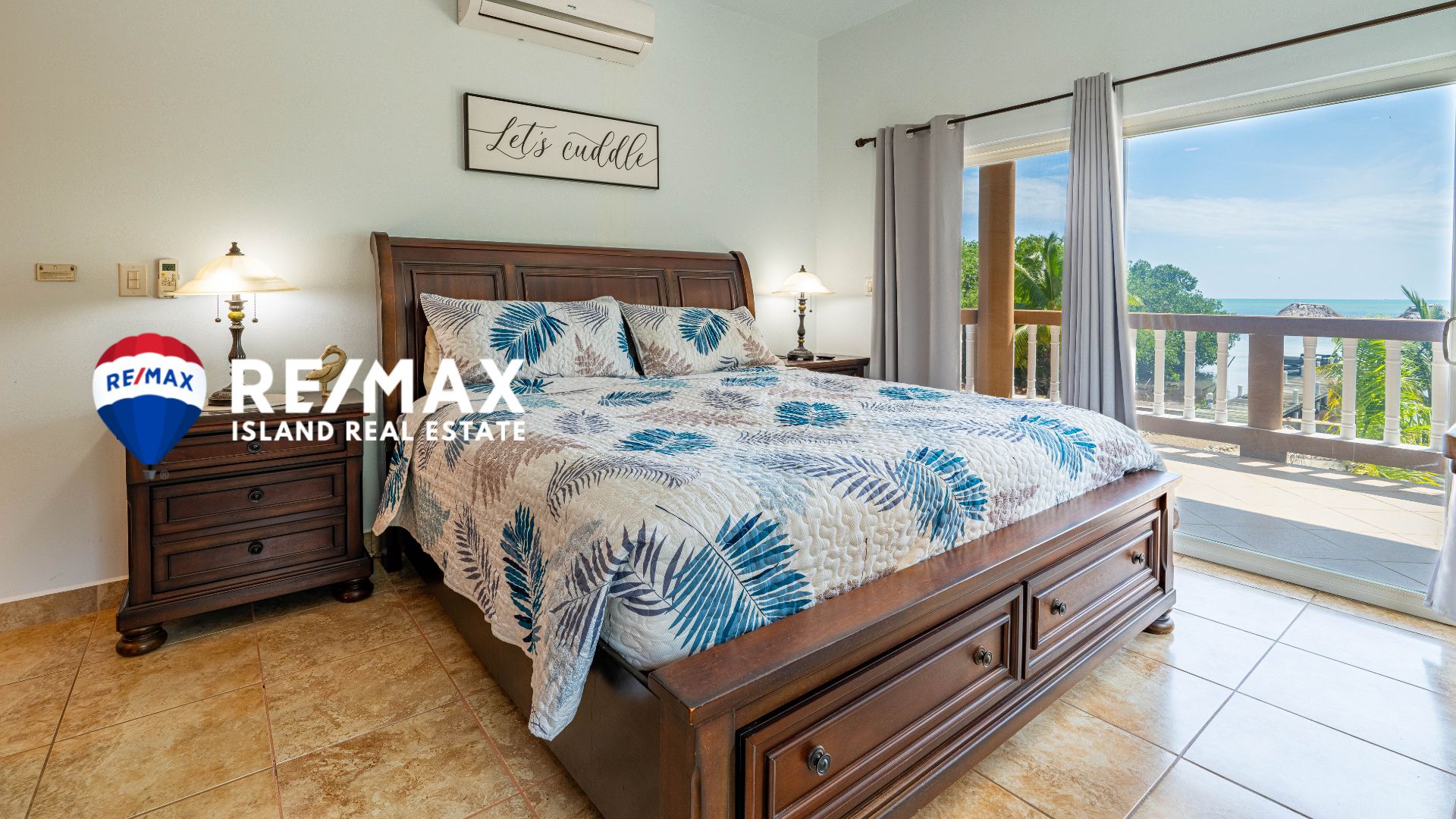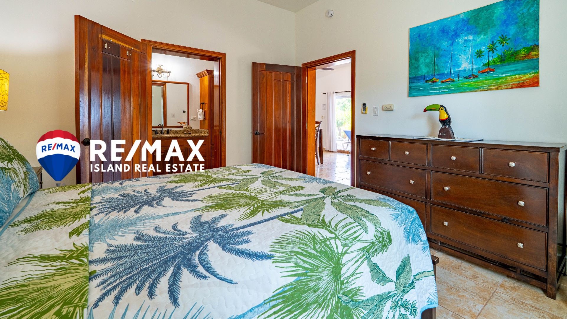 The open kitchen and dining area upstairs frame the ocean perfectly, while the master suite opens onto a private balcony with panoramic sea views. The ensuite bathroom is bright and spacious, designed for island living with a touch of luxury.